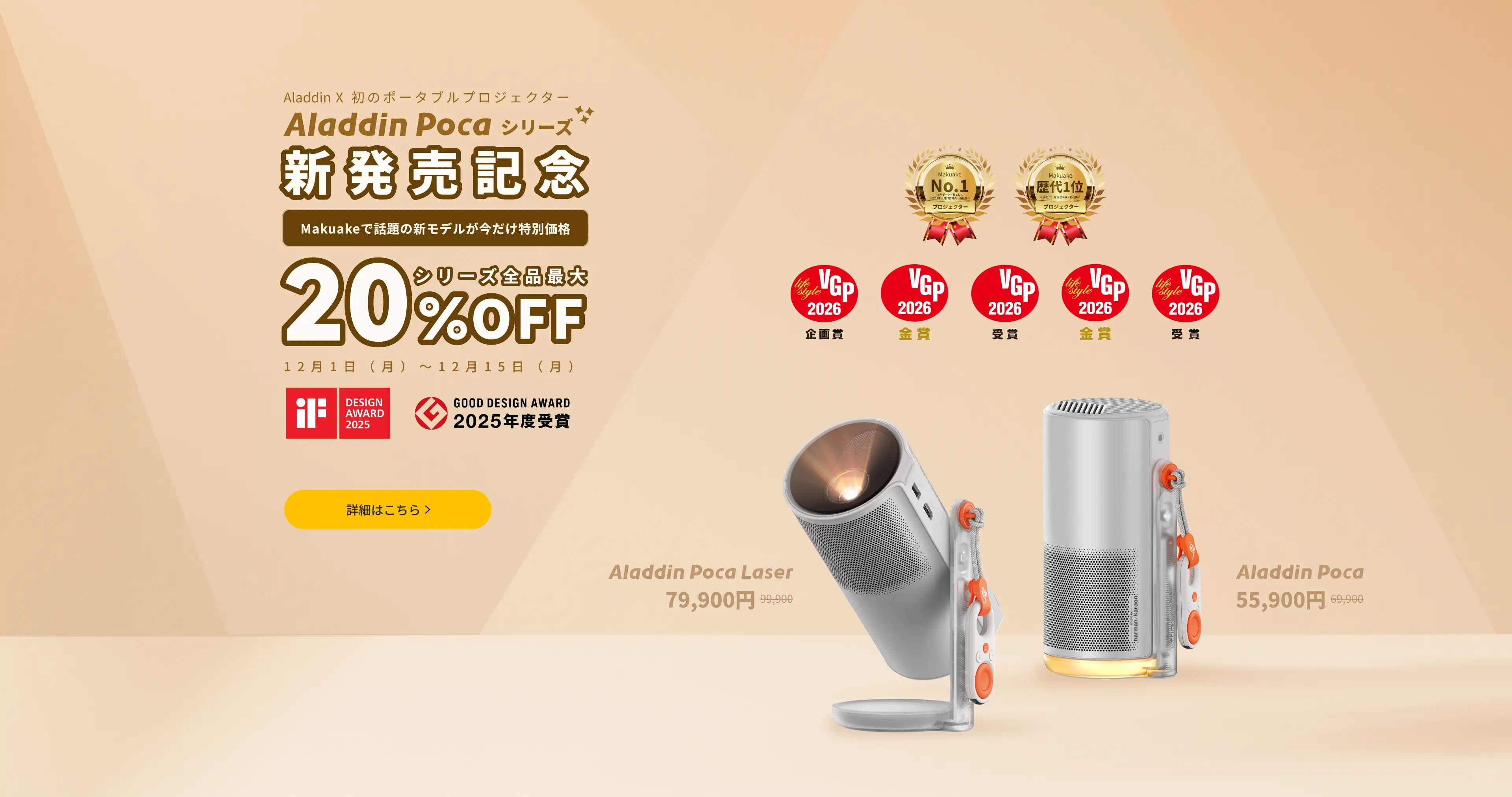 Aladdin Poca(アラジン ポカ)は、コンパクトなサイズと内蔵バッテリーによる「持ち運びの自由」、360°回転ジンバルによる「投影の自由」、そしてAladdin Lensとムードライトが生み出す「創造性」を融合した、Aladdin X初のポータブルプロジェクターです。 デジタルな投影体験が、大切な人とともに過ごすひととき、そして心に残る思い出へとつながっていきます。魔法のつづきを、どこへでも。