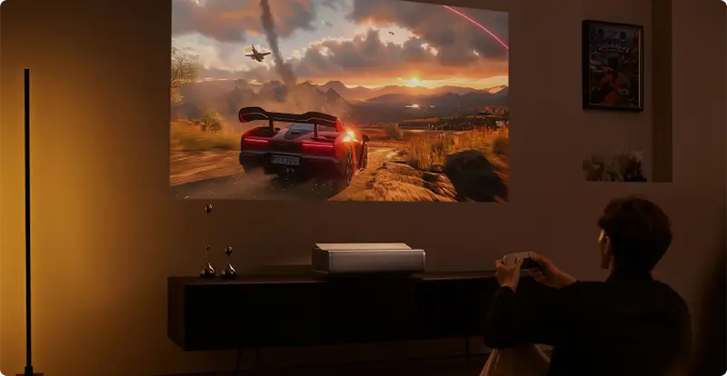 投射比0.177:1の超短焦点設計により、本体を壁からわずか17.8cm離すだけで