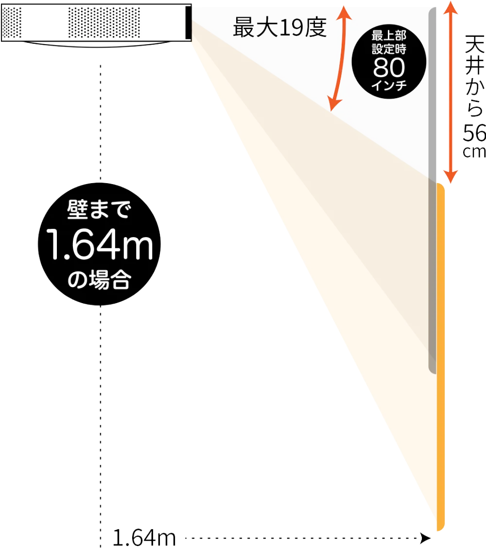 投影画面は、見やすい位置まで上下に調整可能です。そのため、天井の梁を一切気にしなくてもいいのです。レンズは最大19度まで傾斜することができます。