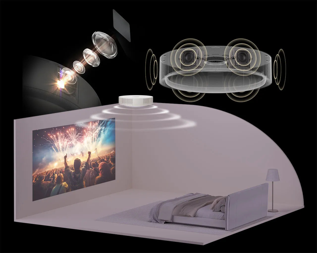 壁からの距離が短くても大画面を実現するレンズ、細かなディテールまで美しく表現する画質(解像度)、天井から立体的に降り注ぎ、没入感を深める高音質なスピーカー。