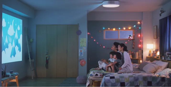 - プロジェクター・スピーカー・照明の3つの機能を1台に集約し、省スペースかつスマートな空間演出を実現します。
