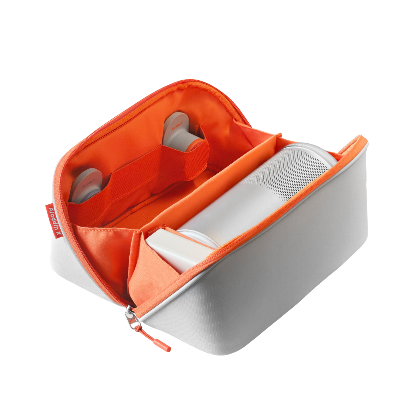 セパレート収納デザインにより、プロジェクター本体・リモコン・アダプター・2つのAladdin Lensをすべて正確に収納することができます。また、持ち運びや保管の際のぶつかりや傷つきをしっかりと保護し、利用の際には必要なものをすぐに取り出すことができます。